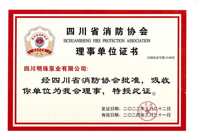 恭賀我司成為四川省消防協(xié)會(huì )理事單位,榮獲證書(shū),消防增壓泵組及電控柜生產(chǎn)廠(chǎng)家!